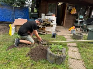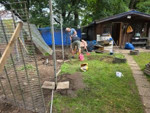 Auch im Kaninchenblockhaus wurde Hand angelegt: Für unsere drei neuen Ausläufe wurden Pfosten zurecht geflext und fachmännisch im Boden verankert. Zudem wurden alte Paletten auseinandergenommen, um sie für Sichtschutz und andere Zwecke weiterverwenden zu können.